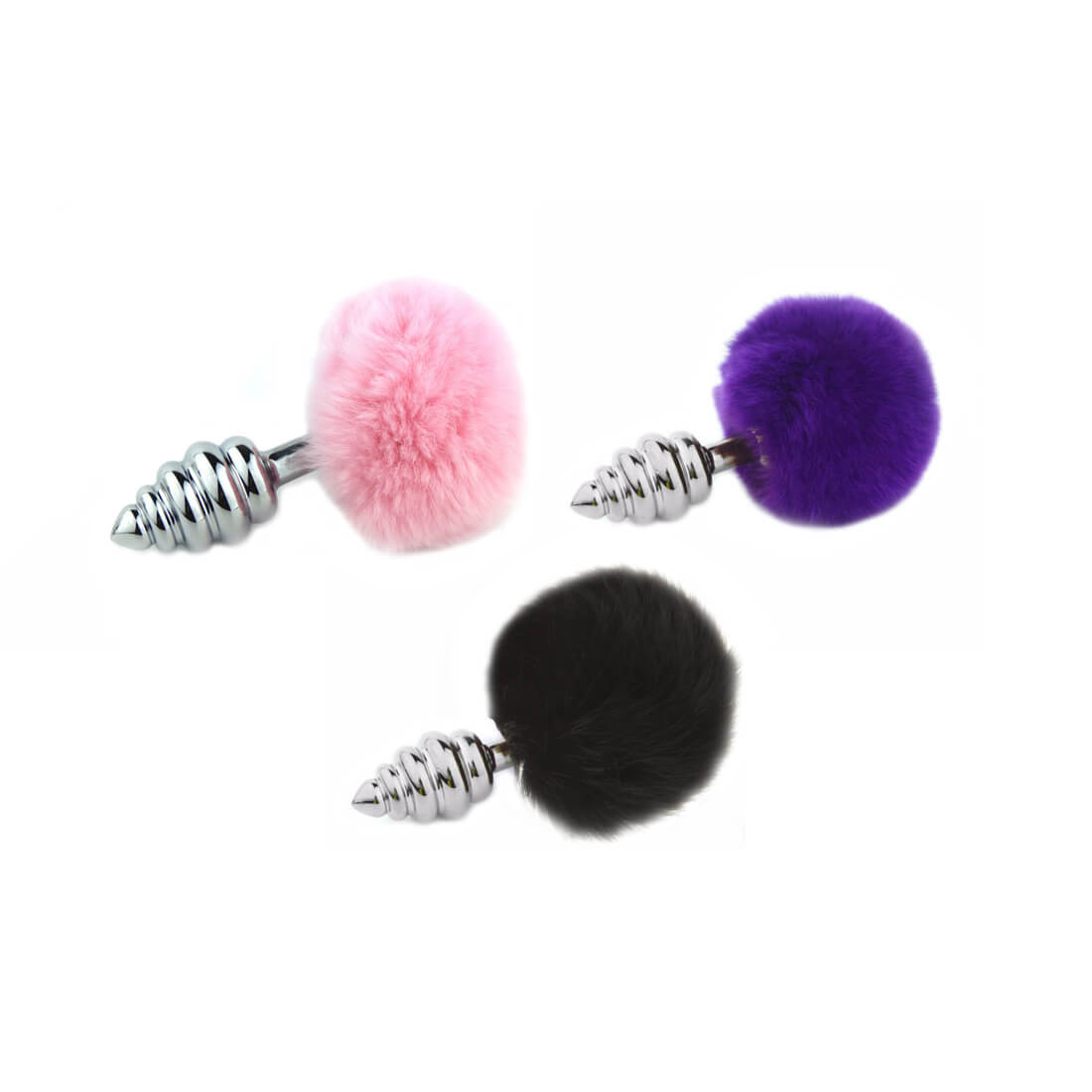 Plug anal tamanho M feito em aço inoxidável com forma escalonada e detalhe de pompom. Disponível em 3 Cores: Preto, Roxo e Rosa.