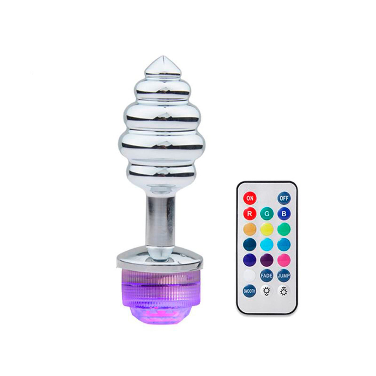 Plug anal escalonado alumínio atóxico para pele, com luzes LED e controle sem fio. Transforme suas relações anais em pura diversão! Dá uma espiadinha!