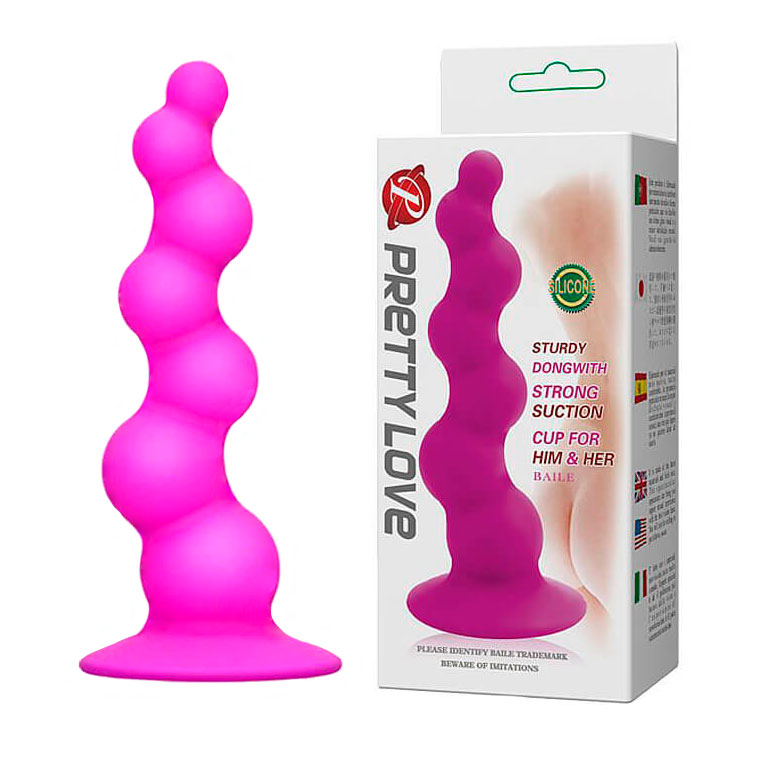 Plug anal confeccionado em silicone com escalonações em forma de esferas que vão do maior para a menor e ventosa.