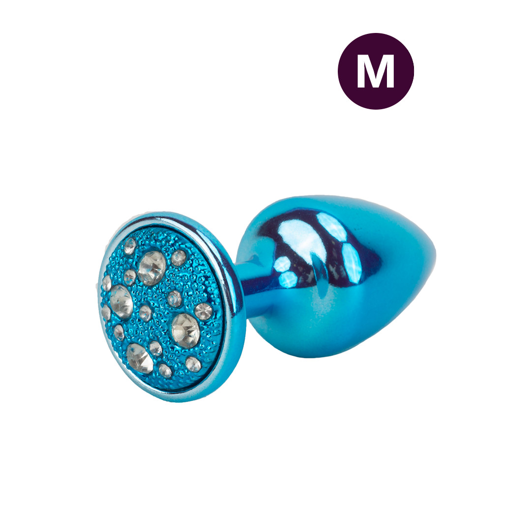 Plug anal tamanho "M" feito em metal com formato cônico e puxador com detalhes em joias cravejada, ideal para praticantes e iniciantes da dilatação anal!