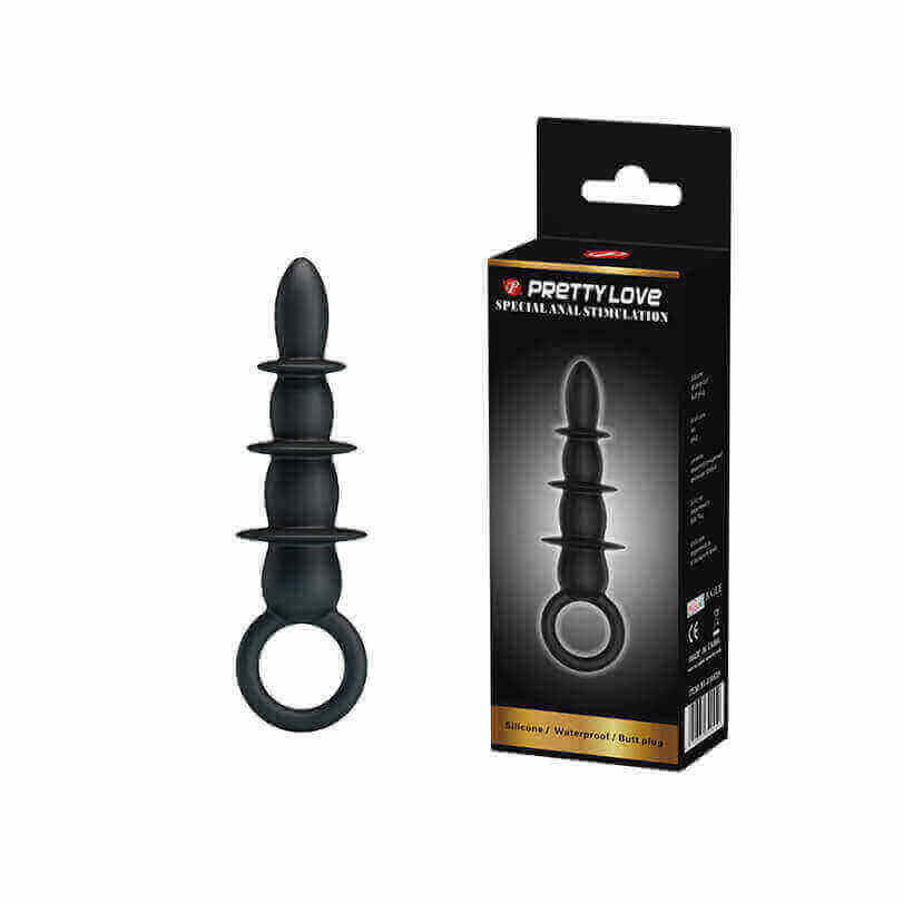 Plug anal confeccionado em silicone com anéis estimulantes e alça de segurança.