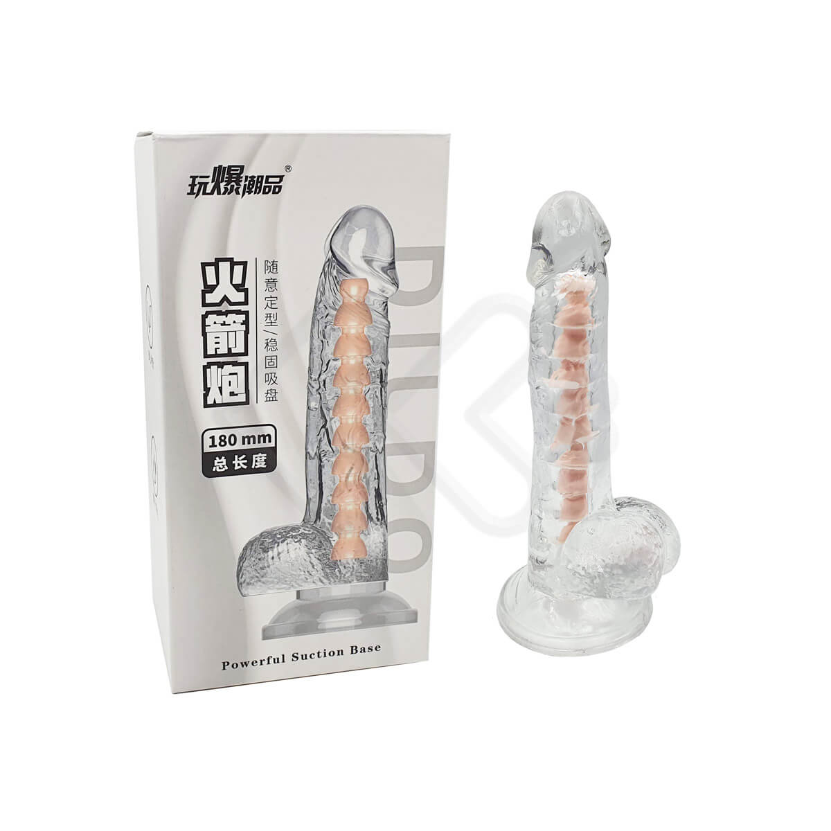 Prótese peniana, feita em silicone translúcido atóxico no formato de pênis realístico com glande definida, veias salientes, vértebras internas, escroto e base ventosa. Ui!