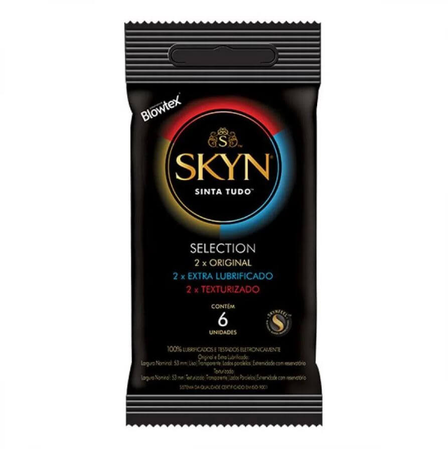 Pacote composto por três modelos diferentes de preservativos, sendo 2 skin original, 2 skin extra lubrificado e 2 skin texturizado. São 6 preservativos em uma embalagem.