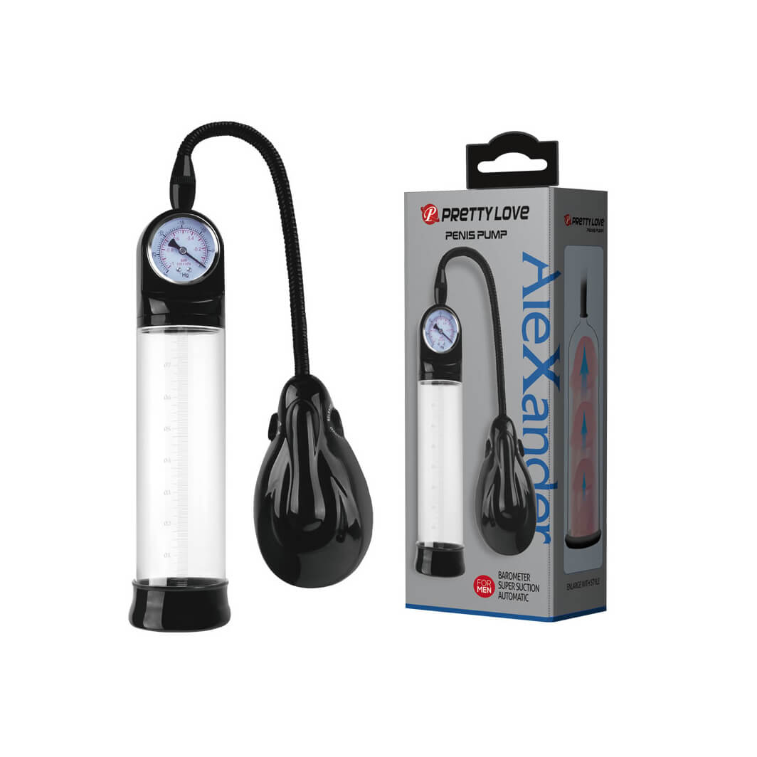 Bomba peniana em TPR com manopla para sucção do ar e manômetro para controlar a pressão interna.