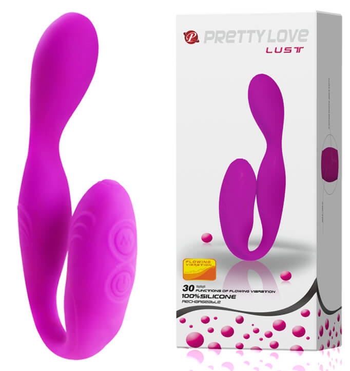 Vibrador recarregável para dupla estimulação. Opa, prazer duplo! Feito em silicone, possui curvatura que estimula o ponto G, e estimulador lateral que estimula o clitóris durante a penetração. Uau!