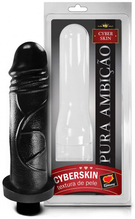 Pênis em cyberskin na cor preto com glande definida, textura anelar, veias, base achatada e vibração multivelocidade, controlada por botão giratório na base.