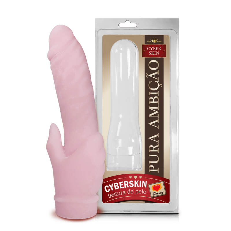 Prótese com formato de pênis com glande definida e a base com forma de mão e textura de veias ao longo do corpo, confeccionado em cyberskin.