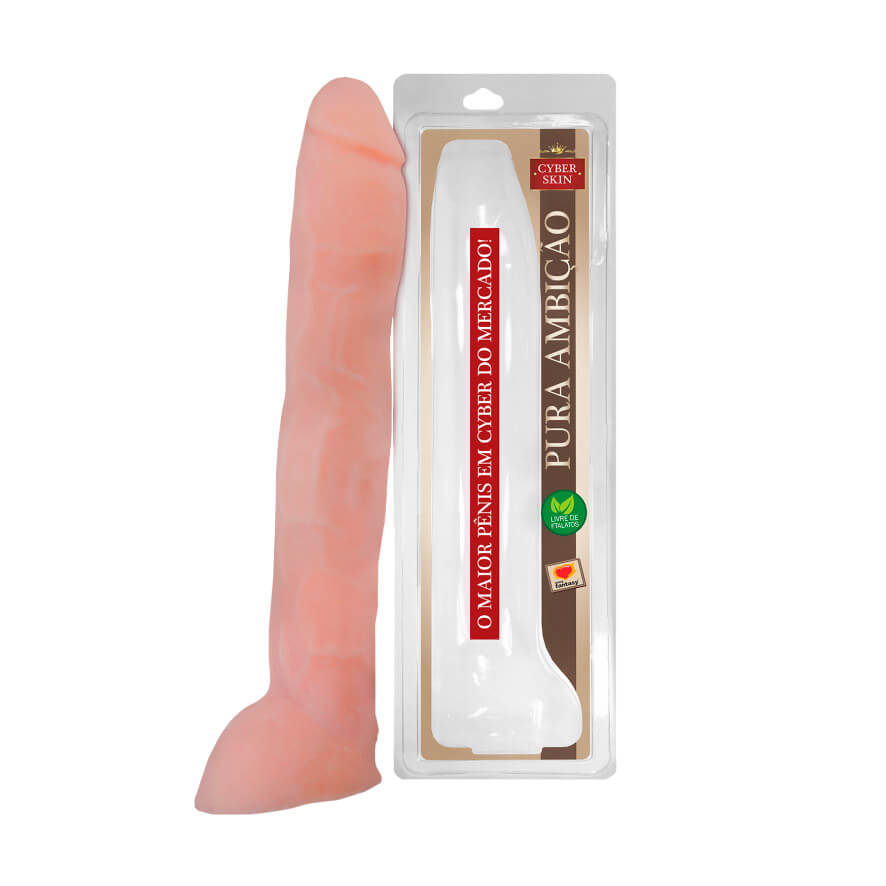 Prótese em formato de pênis realístico com glande definida, escroto e textura de veias salientes ao longo do corpo, confeccionado em cyberskin.