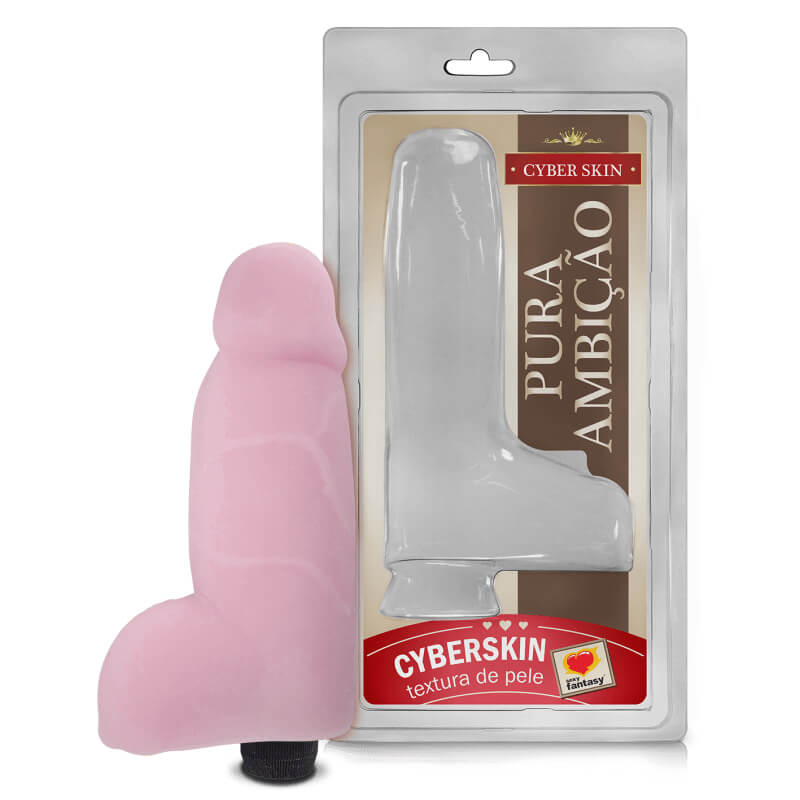Prótese em formato de pênis realístico com glande definida escroto, e textura de veias ao longo do corpo, confeccionado em cyberskin com vibração multivelocidade.