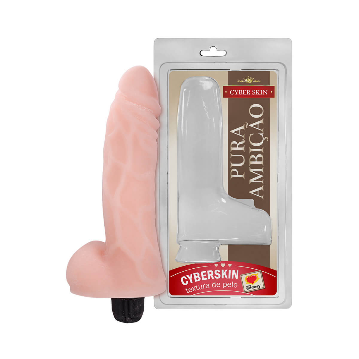 Prótese em formato de pênis realístico com glande definida escroto, e textura de veias salientes ao longo do corpo, confeccionado em cyberskin com vibração multivelocidade.