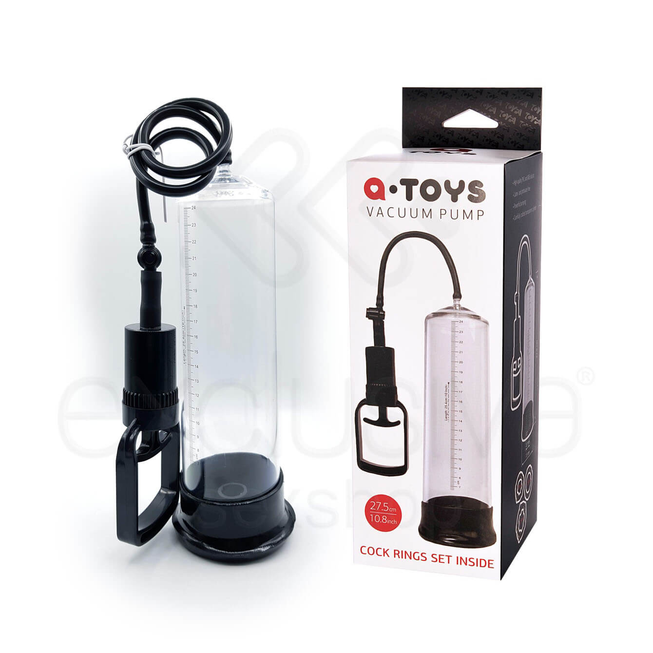 Bomba peniana confeccionada em PVC com manopla. Acompanha kit com 3 anéis penianos de tamanhos divergentes.