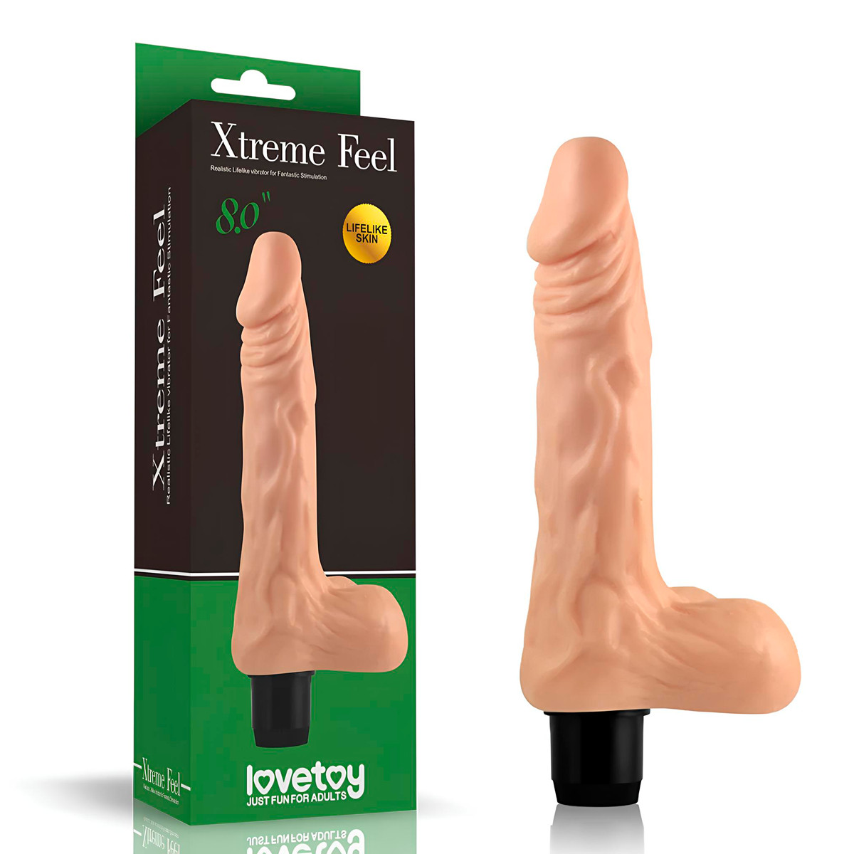 Prótese em formato de pênis realístico com glande definida, textura saliente de veias ao longo do corpo e escroto, confeccionado em cyberskin com vibração multivelocidade.