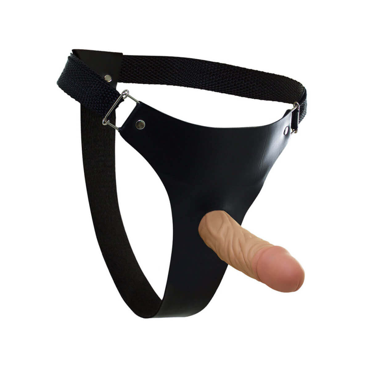 Cinta peniana em couro sintético com pênis realístico confeccionado em silicone de toque macio com glande definida e veias salientes. Ideal para ser usado em inversão de papéis.