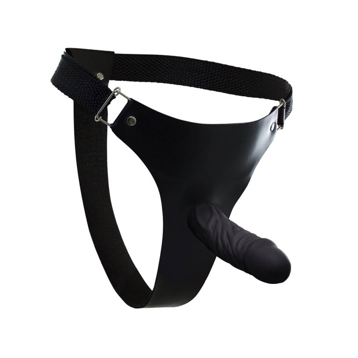 Cinta peniana em couro sintético com pênis realístico confeccionado em silicone de toque macio com glande definida e veias salientes. Ideal para ser usado em inversão de papéis.