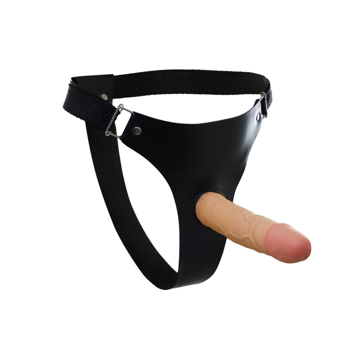 Conjunto com cinta peniana feita em couro sintético e prótese peniana em silicone atóxico com glande definida e veias salientes, a combinação perfeita para uma noite de prazer.