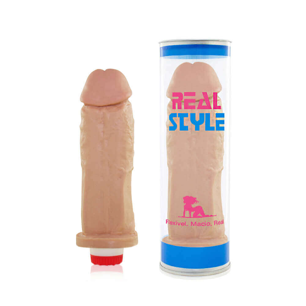 Prótese em formato de pênis com corpo ereto, veias salientes, glande rosada e vibração multivelocidade, perfeito para explorações de zonas mais erógenas.