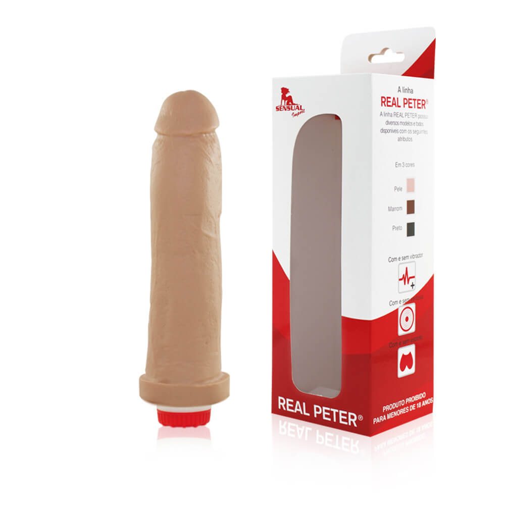Pênis ereto com leve curvatura na ponta, textura de veias, glande rosada e vibração controlada por botão giratório na base. Perfeito para explorações de zonas mais erógenas.
