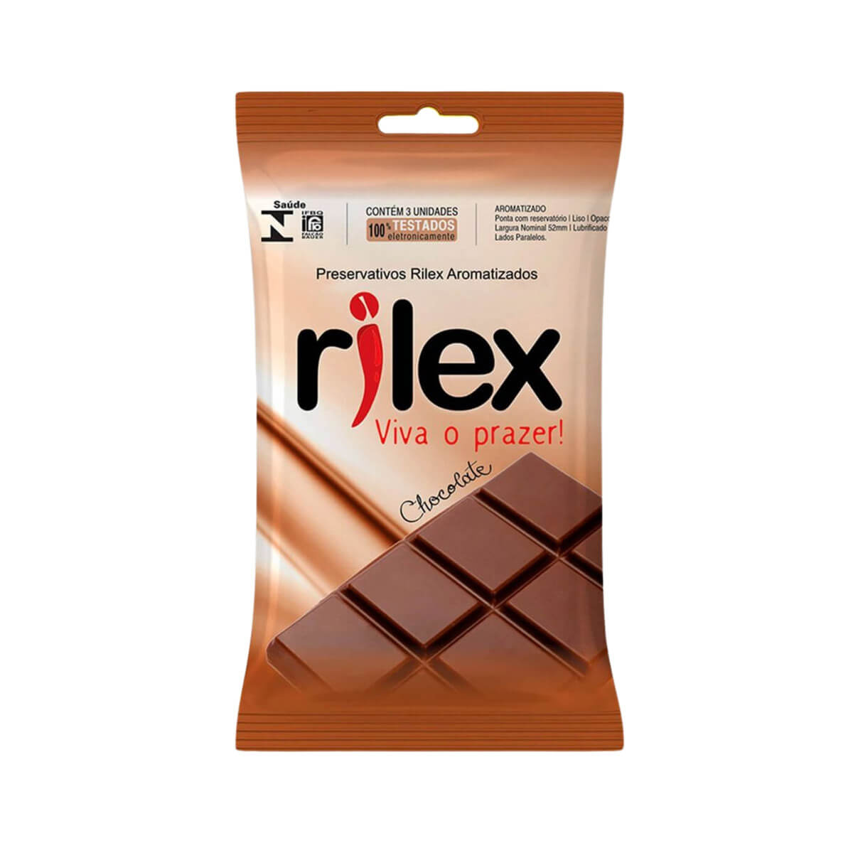 Preservativo lubrificado com aroma artificial de chocolate, feito em látex de borracha natural e óleo de silicone, disponível em embalagem com 3 unidades.