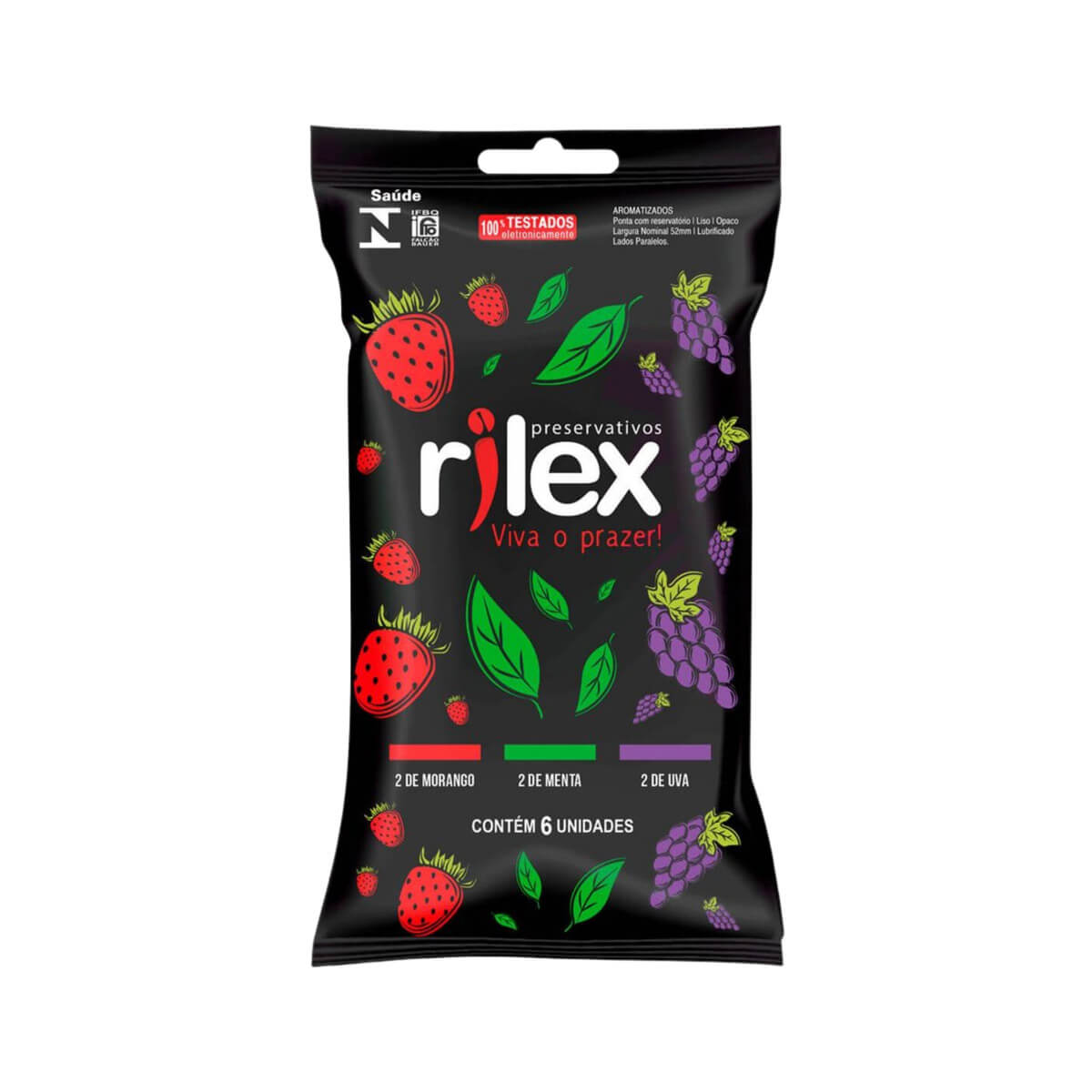 Preservativo lubrificado, feito em látex de borracha natural e óleo de silicone com 3 aromas intensos: Morango, Menta e Uva. Disponível em embalagem com 6 unidades.