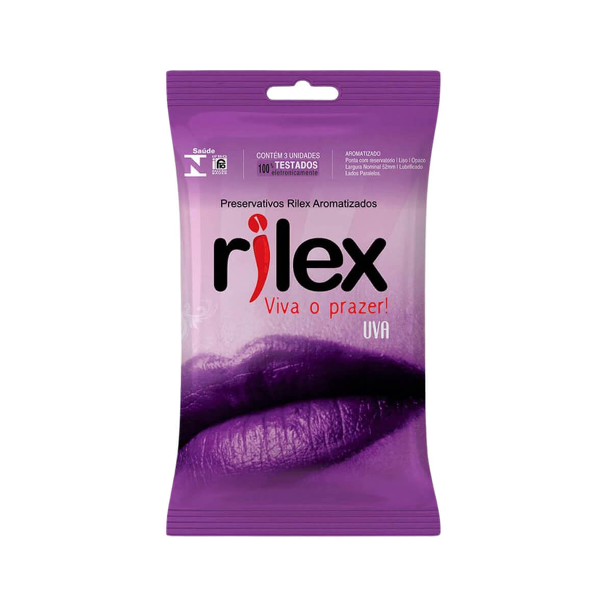 Preservativo lubrificado com aroma artificial de uva, feito em látex de borracha natural e óleo de silicone, disponível em embalagem com 3 unidades.