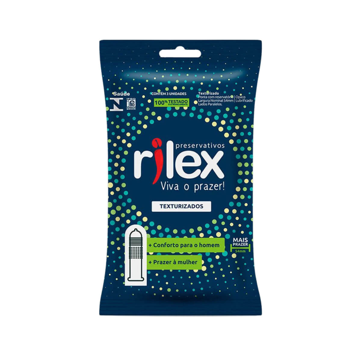 Preservativo masculino lubrificado, 100% testado eletronicamente. Composto por látex de borracha natural e óleo de silicone com 54mm de largura nominal e texturas massageadoras externas.