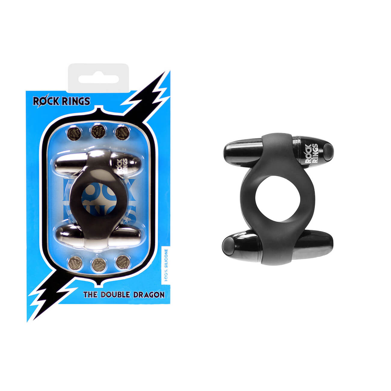 Anel peniano com estimulador de clítoris com duas cápsulas vibratórias que possuem 7 modos de vibração em cada bullet.