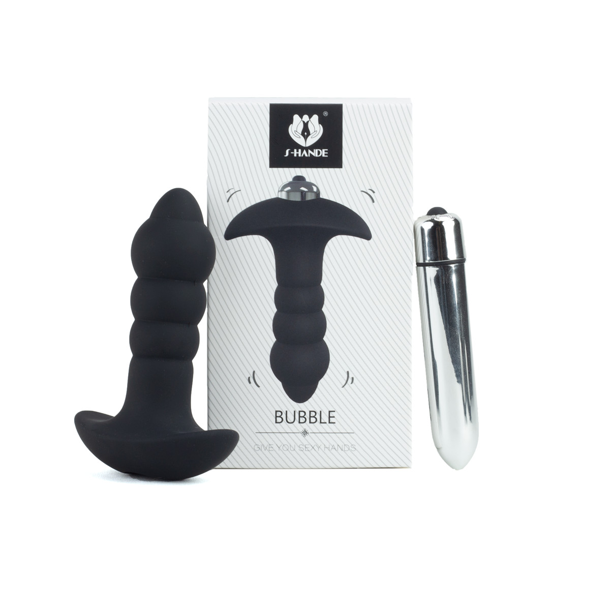 S-Hande Bubble é um plug anal com textura em ondas e bullet vibratório. Pode ser usado junto ou separado para estimular várias zonas do corpo. Vibração única, toque macio e prazer garantido com apenas uma pilha!