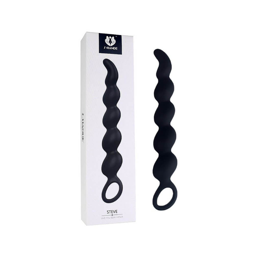 Plug anal feito em silicone soft touch de toque aveludado, a prova d'água no formato escalonado com 5 esferas de tamanhos gradativos e alça de segurança.