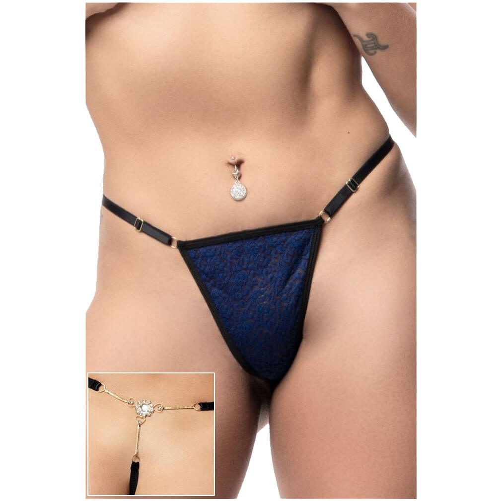 Calcinha feita em tecido super confortável e macio que é super parecido com renda na cor azul, tiras ajustáveis na cintura e bijuterias folheadas.