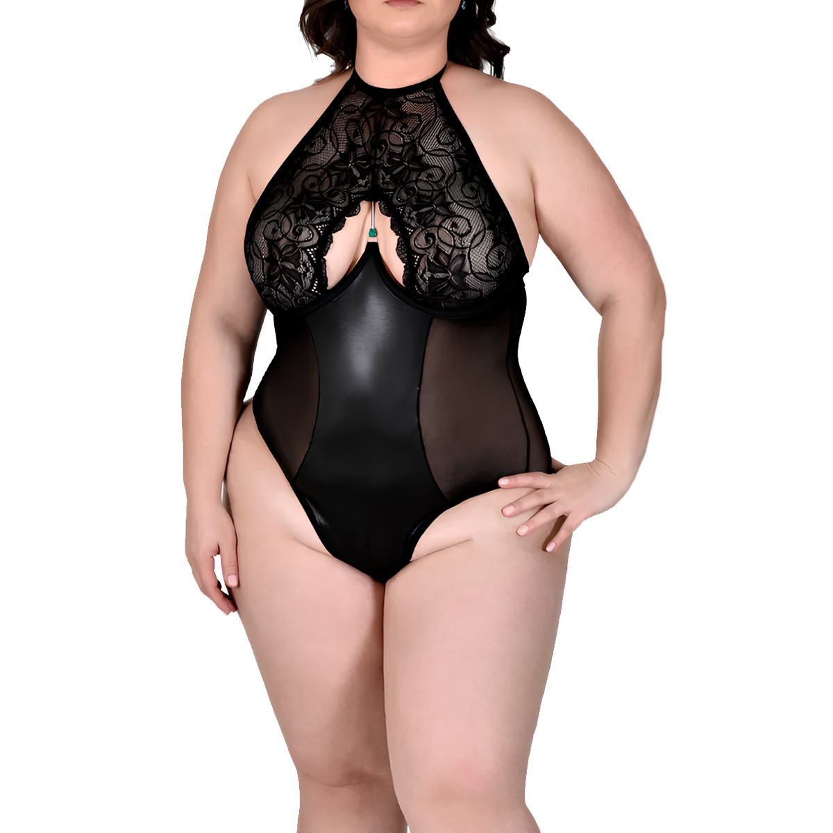 O Body Halter Neck tem modelagem plus size confeccionado recortes de tule e renda, com um charmoso decote no custo e um lindo pingente central, deixando o visual sensual. Quer sabre mais? Vem que te conto aqui!