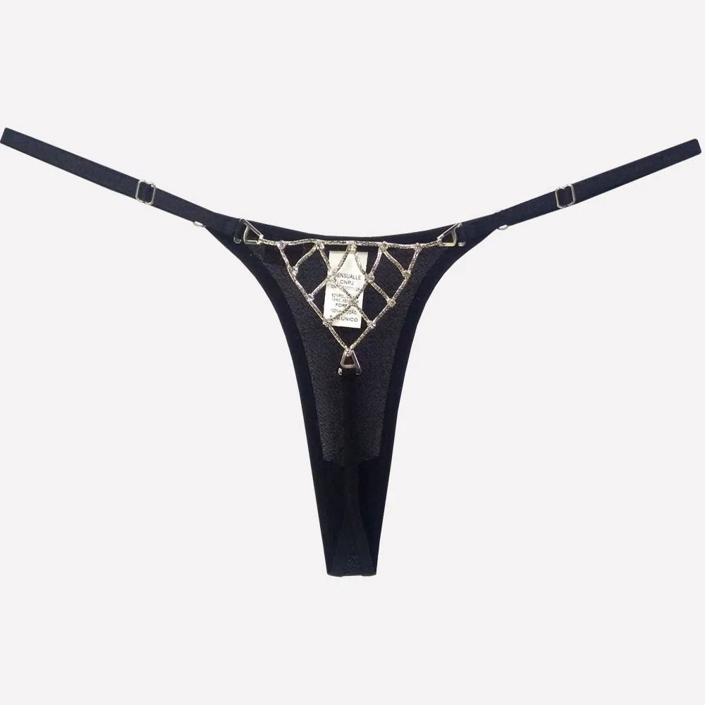 Maravilhosa calcinha fio dental com detalhe de biju na parte traseira da peça em forma de triângulo.
