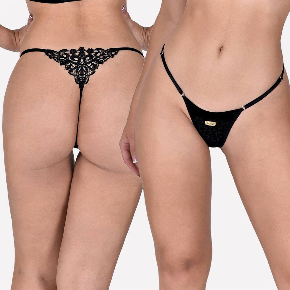 Calcinha fio dental toda confeccionada em veludo e guipir com ajuste na lateral.