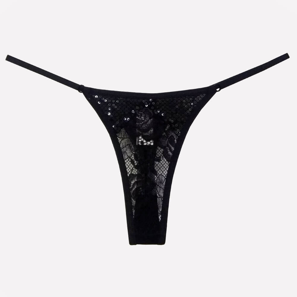 Calcinha confeccionada em renda floral com detalhes em paetê e ajuste lateral de tamanho.