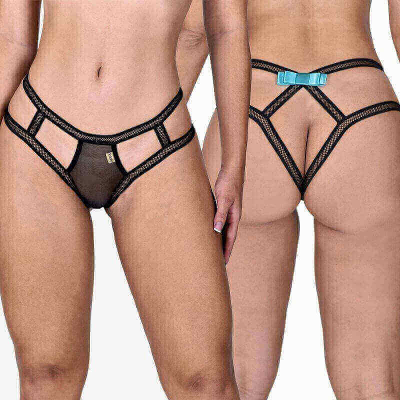 Calcinha confeccionada em tule com tiras por toda a calcinha e abertura íntima. Perfeita para casais apressadinhos!