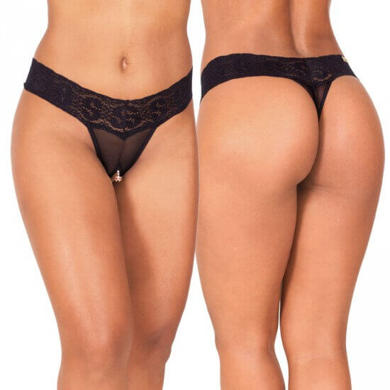 Calcinha fio dental com tiras em renda, tule transparente, abertura na região íntima e pequena jóia com strass pendurada.