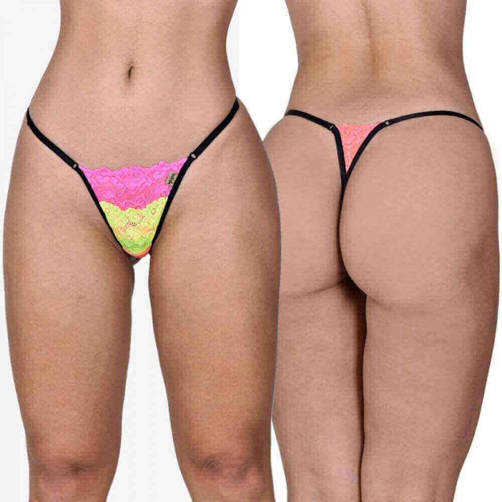 Calcinha fio dental toda confeccionada em renda com três cores e tiras laterais ajustáveis.