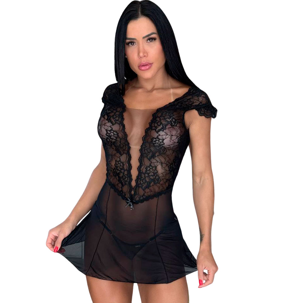 Desenhada para ser o equilíbrio perfeito entre a sofisticação da renda e a ousadia da transparência. O grande destaque fica por conta do seu decote profundo, que utiliza o tule de forma estratégica para valorizar o busto com uma sensualidade elegante, enquanto as laterais em renda abraçam as curvas do corpo com delicadeza.