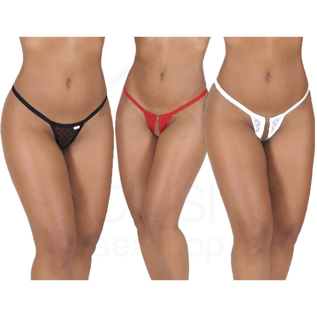 Três calcinhas confeccionadas em renda com detalhes de coração por toda as peças, onde cada uma delas possuem aberturas de tamanhos diferentes, nas cores: branco, preto e vermelho.