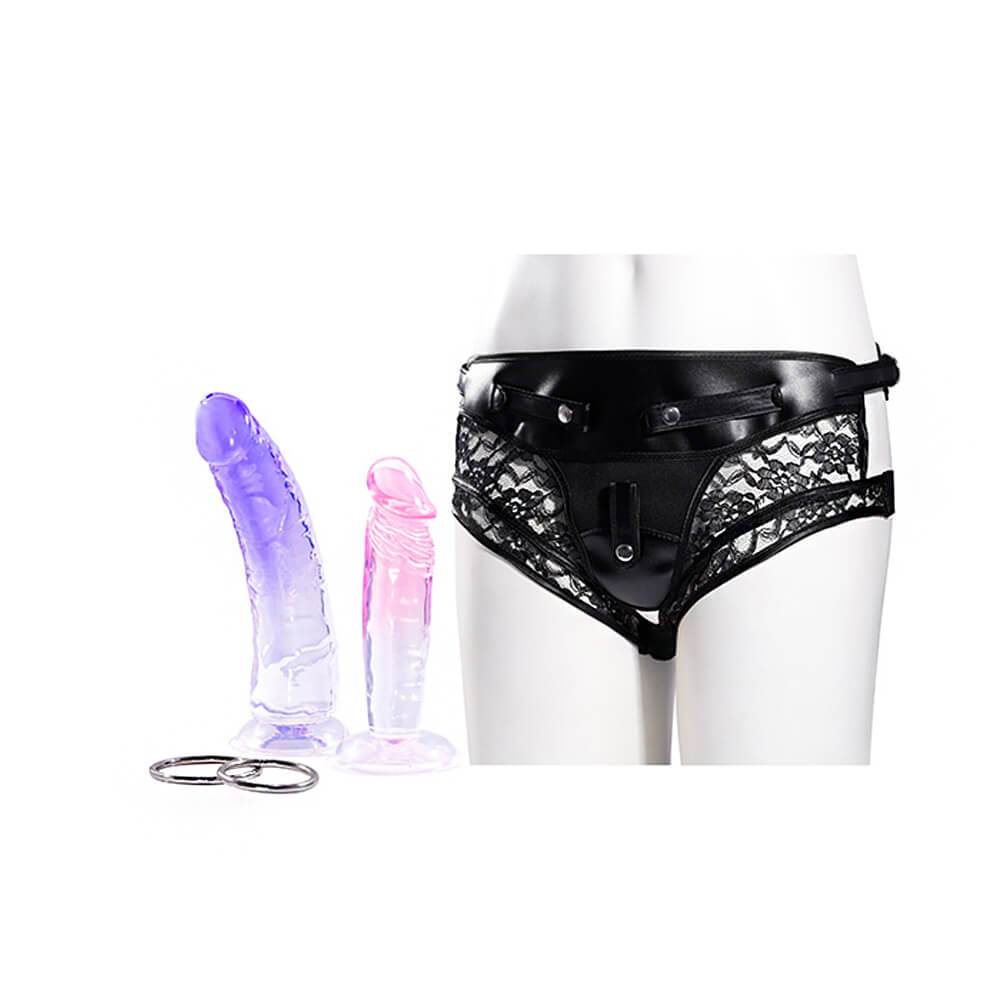 Cinta peniana feita em couro sintético e renda, com prótese de diferentes tamanhos em gel translúcido e argolas para encaixe na cinta. Aproveite e apimente a relação com esse produto!