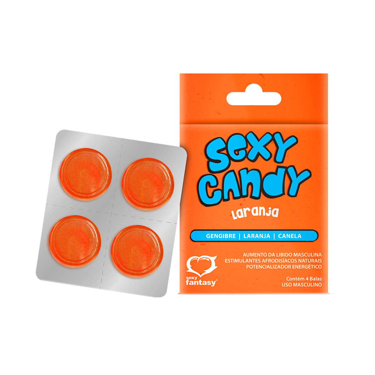Bala estimulante para o aumenta do libido masculino, com potencializador energético no sabor laranja composto por gengibre e óleo essencial de canela.
