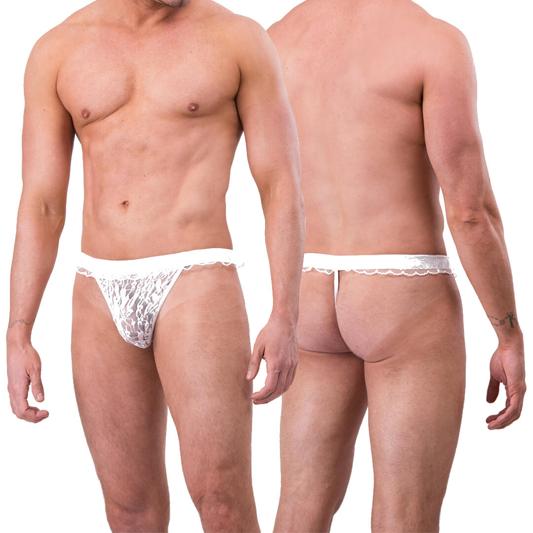 Cueca confeccionada em renda floral na cor branca com abertura na traseira e elástico reforçado, que faz com que a peça ajuste-se perfeitamente ao corpo.