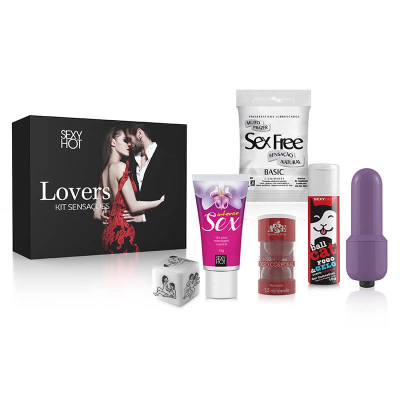 Kit composto por bullet, dado, preservativos, óleo para massagem, bolinha explosiva e um excitante feminino.