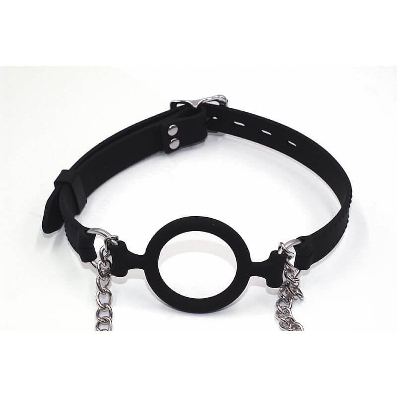 Mordaça em forma de anel com cinta que possui ajuste por fivela e ainda conta com grampos para mamilos embutidos. Confeccionado em silicone e aço.