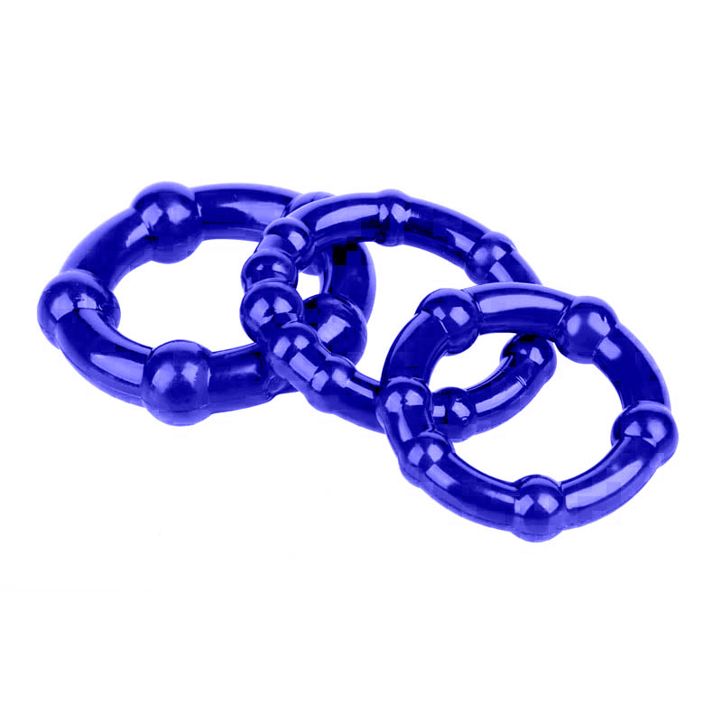Kit com 3 anéis penianos, feitos em silicone atóxico de toque macio e suave. Possui material flexível, livre de ftalatos com tamanhos diferentes e esferas massageadoras.