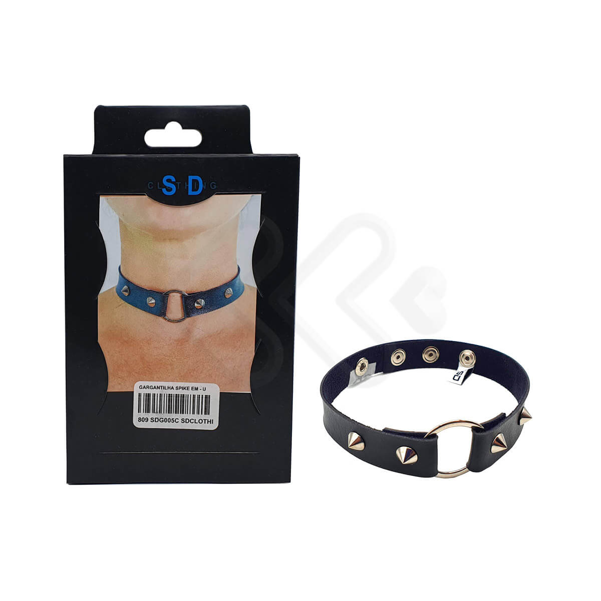 Gargantilha no tamanho único, feita em couro sintético com detalhes de spikes, 3 botões de pressão e argola central para aplicação de correntes.