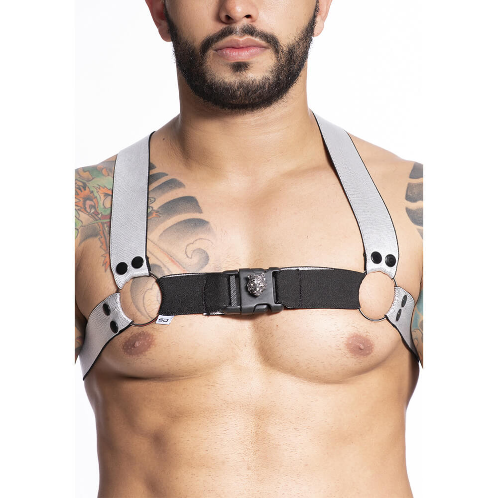 Arreio Harness feito em tiras elásticas bicolor, com argolas em metal e fecho frontal com detalhe em leão. Ideal para ser dominado e ter momentos mais que prazerosos.
