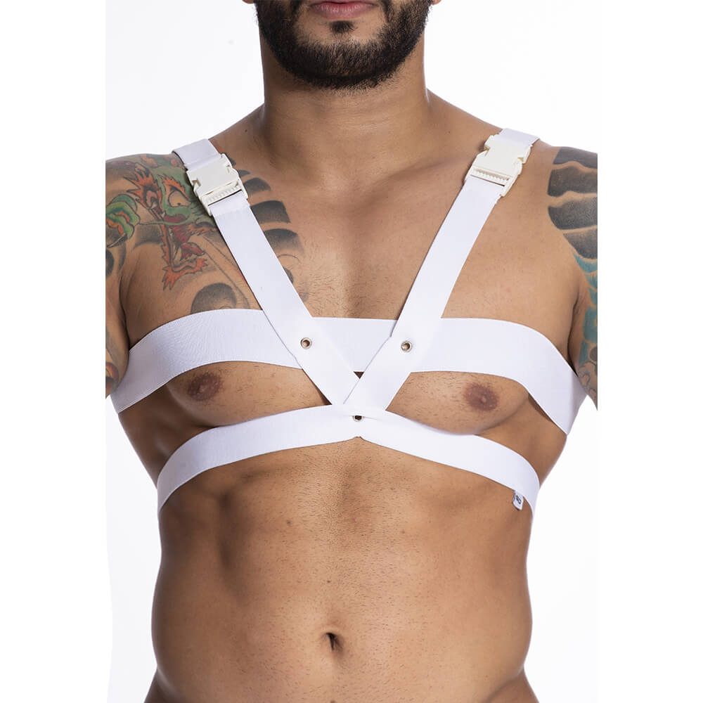 Harness todo confeccionado em tiras elásticas com fechos de plástico, argola triangular e detalhes em rebites.