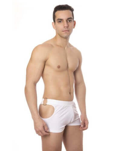 Cueca boxer com abertura lateral e detalhe de argola. Chega mais!