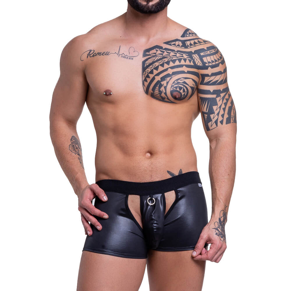 Cueca boxer confeccionada em cirrê com cor cintilante e abertura frontal, facilitando os momentos de prazer.