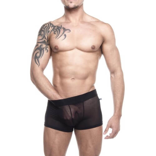 Cueca boxer confeccionada em tule transparente que possui um elástico resistente e confortável.